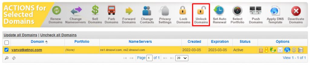 Tích chọn vào ô vuông trước tên miền cần chuyển > Unclock Domains